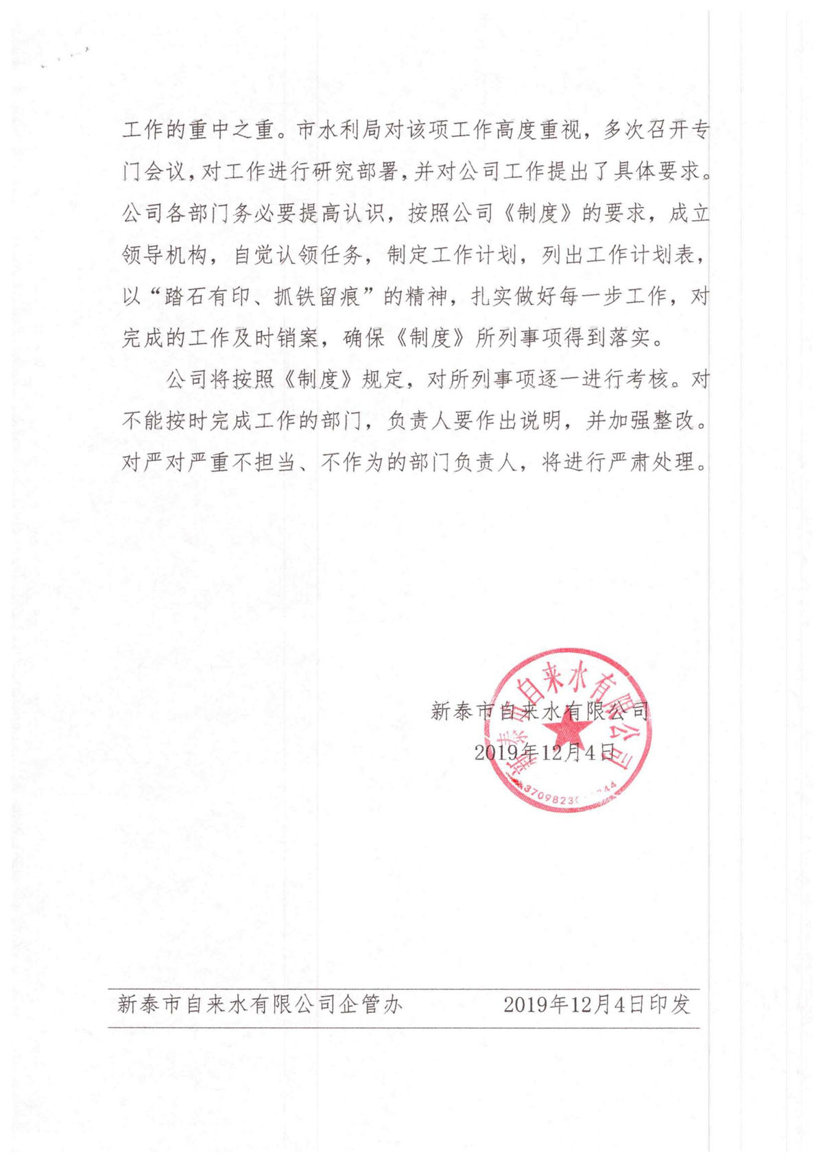 公司將繼續(xù)團結(jié)拼搏、求實創(chuàng)新、與時俱進,力求在供水生產(chǎn)、經(jīng)營、管理等方面取得突破性發(fā)展,進一步拓寬供水管網(wǎng)建設(shè)和改造步伐,夯實安全生產(chǎn)管理,提升優(yōu)質(zhì)服務(wù)水平,確保城市供水事業(yè)又好又快發(fā)展,為建設(shè)幸福和諧新新泰提供更好的供水環(huán)境。